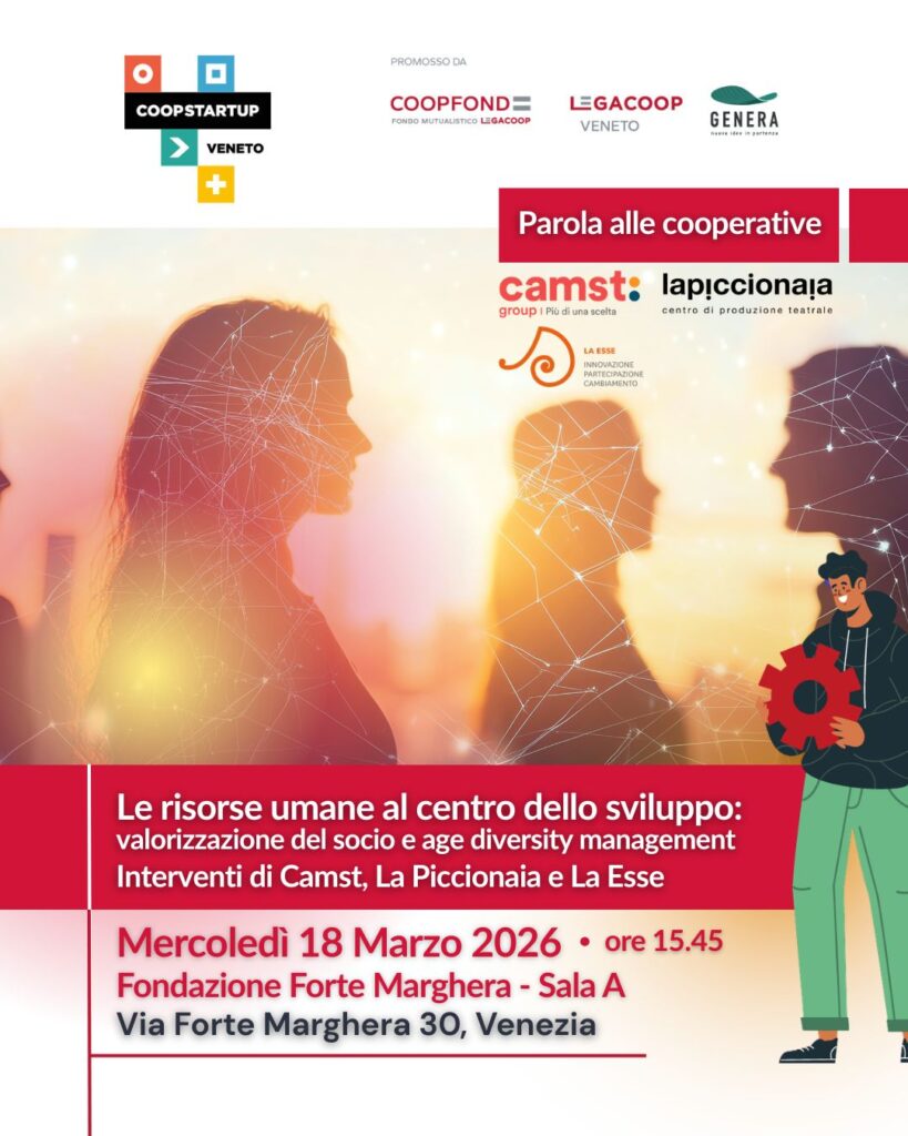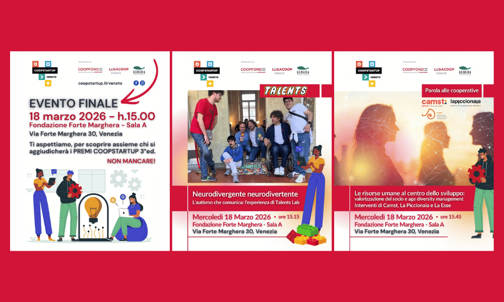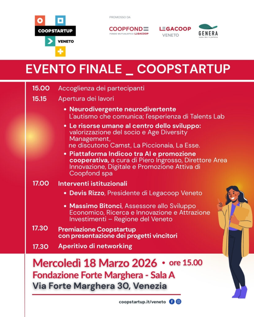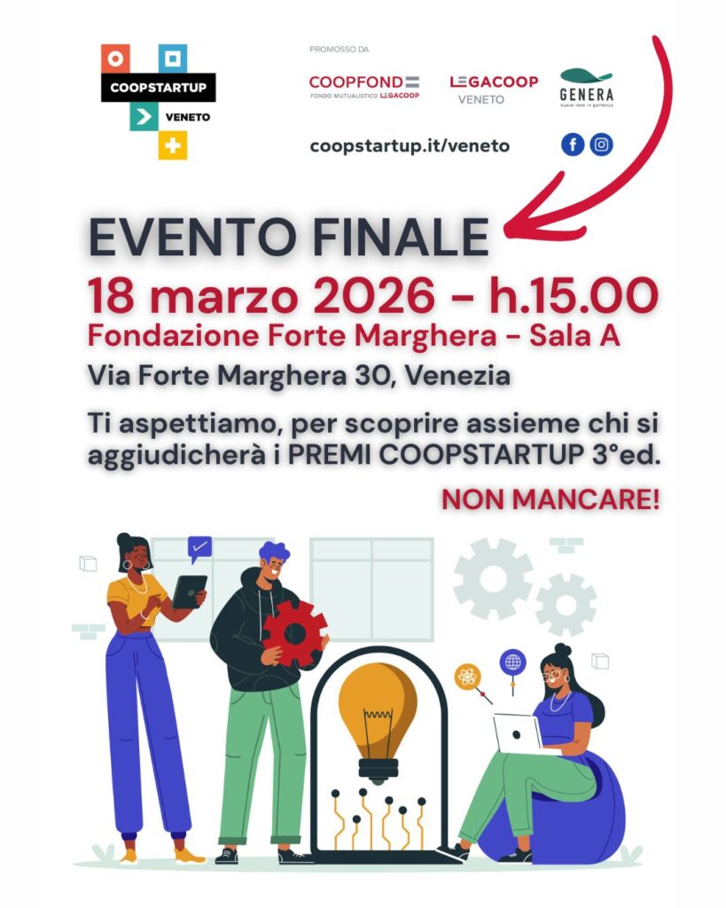 Mercoledì 18 marzo 2026, a partire dalle ore 15.00, presso la Fondazione Forte Marghera si terrà l’atto conclusivo di Coopstartup Veneto. Il programma, promosso da Legacoop Veneto e Coopfond, giunge al termine di un intenso percorso di formazione e tutoring volto a trasformare potenziali idee in startup cooperative sostenibili.