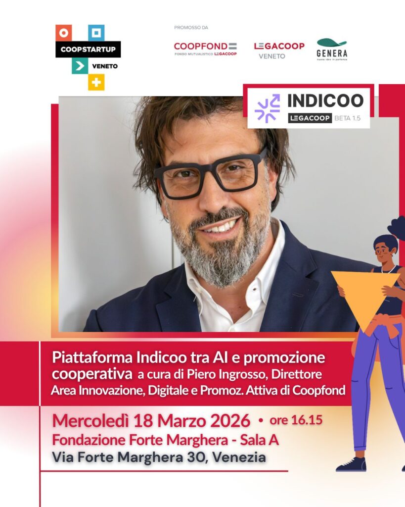 - intelligenza artificiale: approfondimento sulla piattaforma Indicoo e la promozione cooperativa digitale a cura di Piero Ingrosso (Direttore Area Innovazione, Digitale e Promozione Attiva di Coopfond);