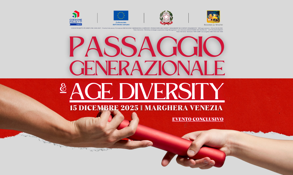 Nell’ambito della direttiva regionale DGR 110/2024 “Generazioni a confronto: promuovere Age Diversity Management nei contesti organizzativi”, Legacoop Veneto annuncia l’evento di chiusura PASSAGGIO GENERAZIONALE & AGE DIVERSITY dei progetti “Think care” di Kairosforma (codice 1348-0001-110-2024) e “Age Diversity Management” di Isfid Prisma (codice 1042-0001-110-2024). L’appuntamento – un’iniziativa strategica per il settore cooperativo e le organizzazioni del terzo settore dedicate alla cura delle persone – è stato organizzato da Isfid Prisma assieme e con il contributo di KairosForma ed è fissato per il pomeriggio del 15 dicembre 2025 a Marghera, Venezia.
