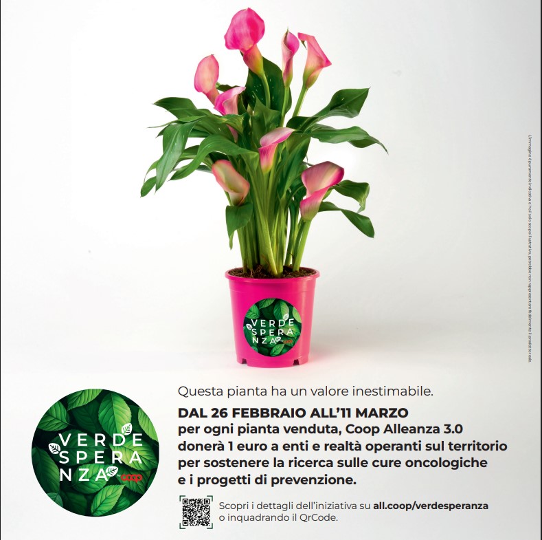 Al via da oggi 26 febbraio, la campagna Coop “Verde Speranza”: per soci e consumatori sarà possibile contribuire a sostenere enti, poli di ricerca e ospedali specializzati nella prevenzione e cura oncologiche acquistando una delle piccole piante Verde Speranza in vendita negli oltre 340 negozi di Coop Alleanza 3.0, ubicati nelle 8 regioni – dal Friuli Venezia Giulia alla Puglia – in cui la Cooperativa è presente.